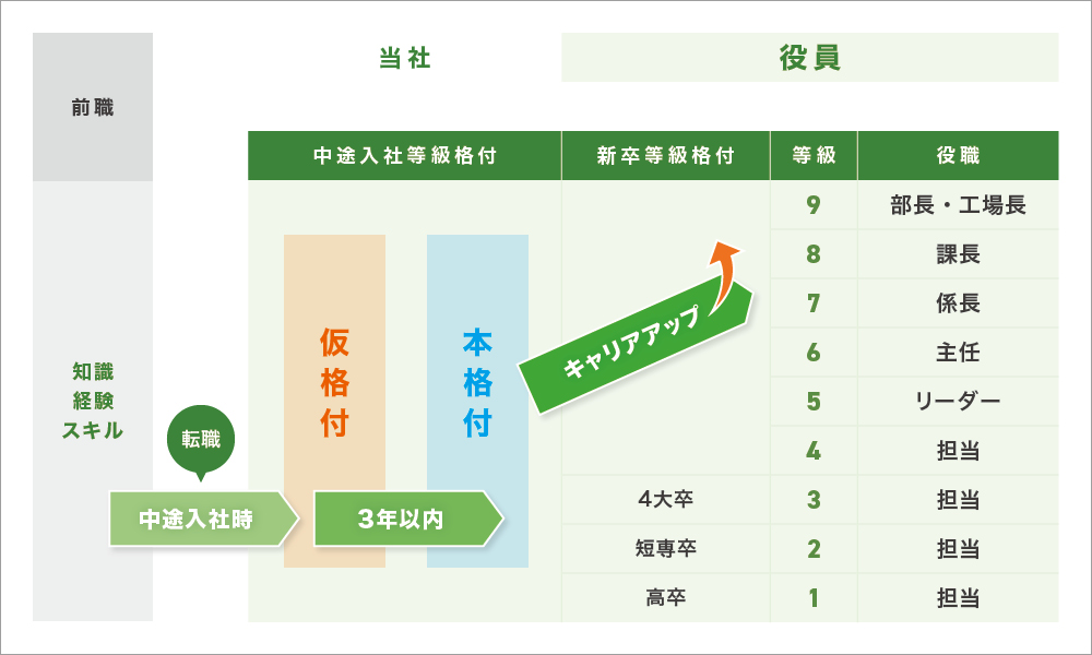 当社の人事制度は等級制度を基本とし、前職での知識・経験・スキルを踏まえつつ入社後も適正に評価される仕組みを整えています。入社後は3年以内に実績に応じた等級見直しを行い、力ある方が公平に評価され、活躍の場を広げキャリアアップを実現できる環境を目指しています。